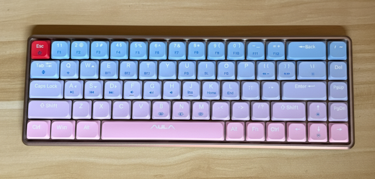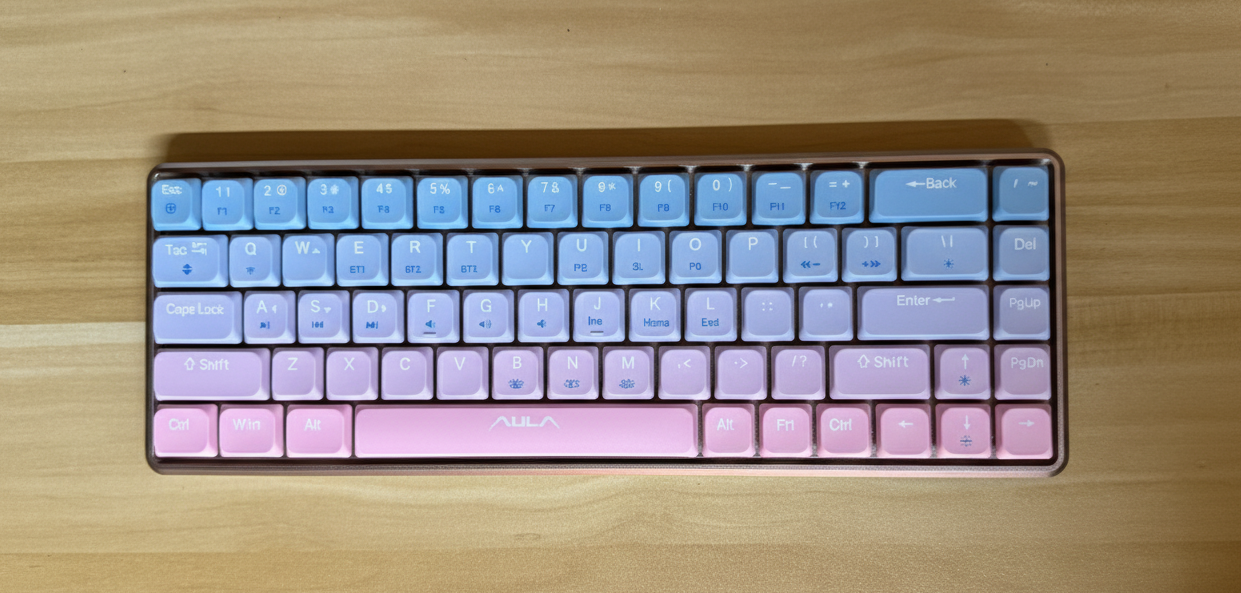 AULA 的這款H68共有五種花色,我覺得其中兩種(落雨玲瓏、紫醉鷲迷)比較好看,這兩款的配色都很漂亮,當時就是被這外觀吸引,才決定買H68。我最後選了「落雨玲瓏」這款。購買前我有到B站2搜尋,但幾乎都是青軸版本的開箱影片,由於我個人不喜歡青軸的聲音,所以就選了廠商的自研紅軸版本。