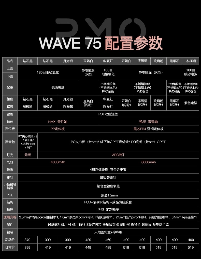 - Wave75的前輩是紅了兩年的Raniy75,它們都屬於「量產的客製化鍵盤」。喜好機械鍵盤的網友們認為它們擁有客製化的規格及品質,比得上以前千元RMB等級的客製化鍵盤,但WOB與PMO將全鋁殼的機械鍵盤做到量產化且售價壓低,因此這兩家製作的全鋁鍵盤被認為是鋁坨坨鍵盤入門的高CP選擇。 ↩︎