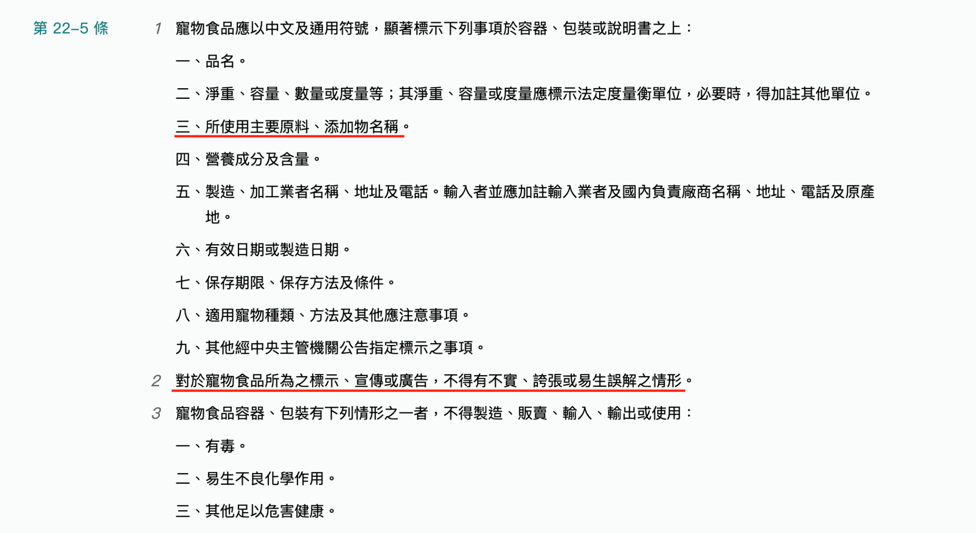 請看圖中紅字部分,台灣的動物保護法只有規定寵物食品要列出「主要」原料及添加物,並沒有規定要「標示全部原料」。